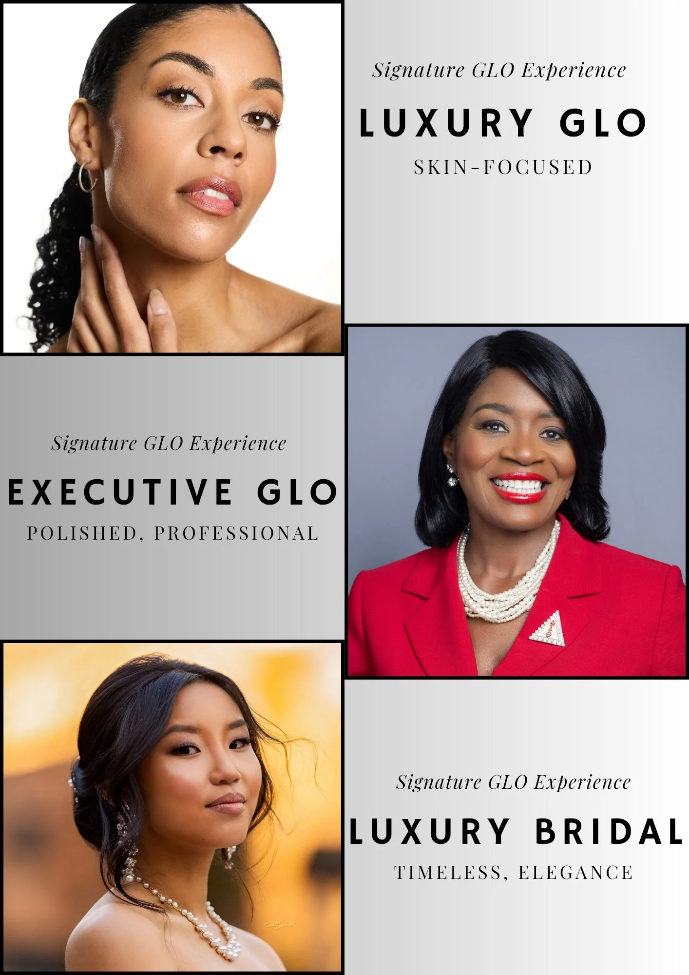 Luxury Makeup Artistry for Women who value presence, polish and perfection. The Signature GLO Experience is curated luxury beauty service designed for women who desire effortless elegance, skin-focused artistry, and flawless, photo-ready finish.